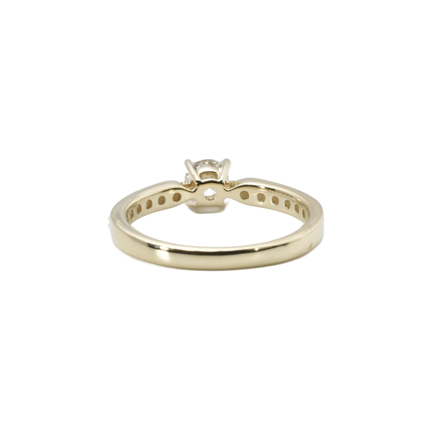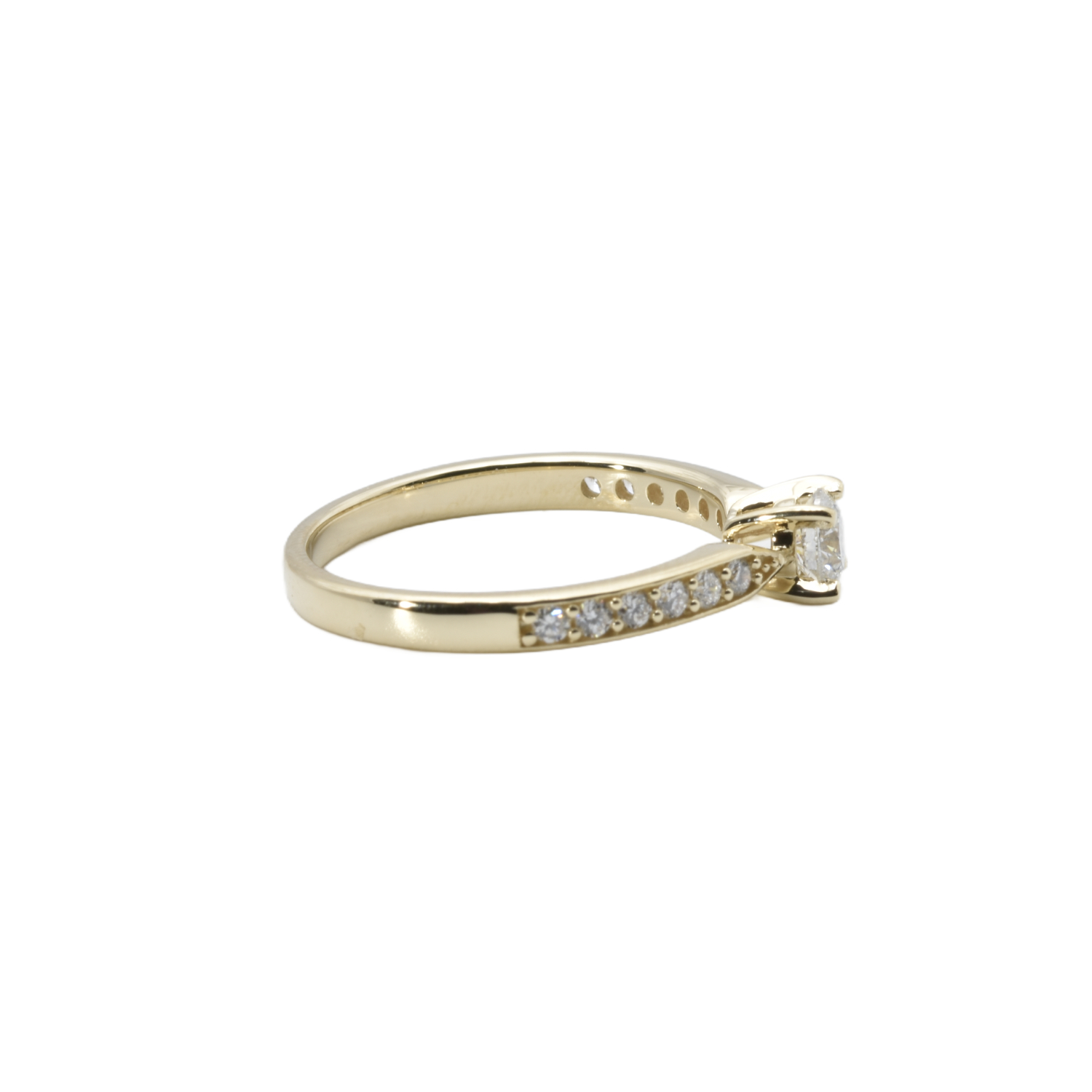 Edler Ring aus Gelbgold im Solitär-Stil, der durch seine besondere Gestaltung überzeugt: Die obere Hälfte der Ringschiene ist mit funkelnden Brillanten ausgefasst und sorgt für ein intensives, luxuriöses Strahlen.