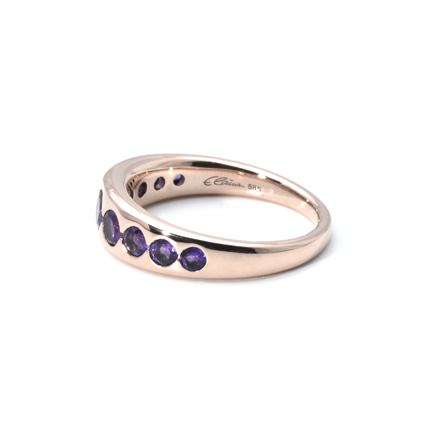 Dieser stilvolle Ring aus 14 Karat Roségold besticht durch neun leuchtende Amethyste in elegantem Lilaton. Mit einem Gewicht von 5,5 g und der Ringgröße 56 bietet er eine angenehme, hochwertige Haptik. Das Pre-Owned-Schmuckstück wurde fachmännisch aufgearbeitet und präsentiert sich in hervorragendem Zustand – ein edler Blickfang mit besonderem Charakter.